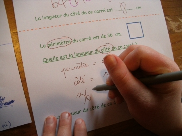 apprend qu'il faut diviser le périmètre par 4 pour trouver la longueur