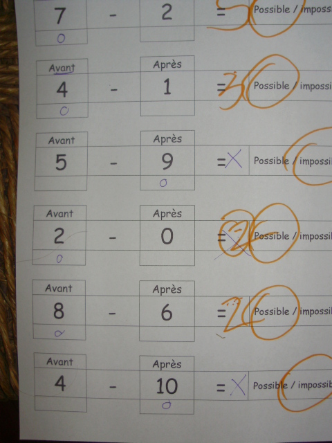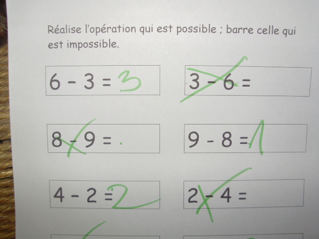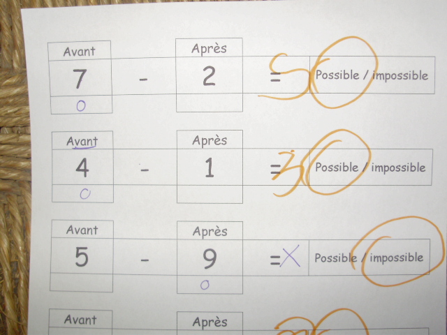 - des fiches qui reprennent les deux mêmes nombres pour réaliser la soustraction, et il doit indiquer celle qui est possible :