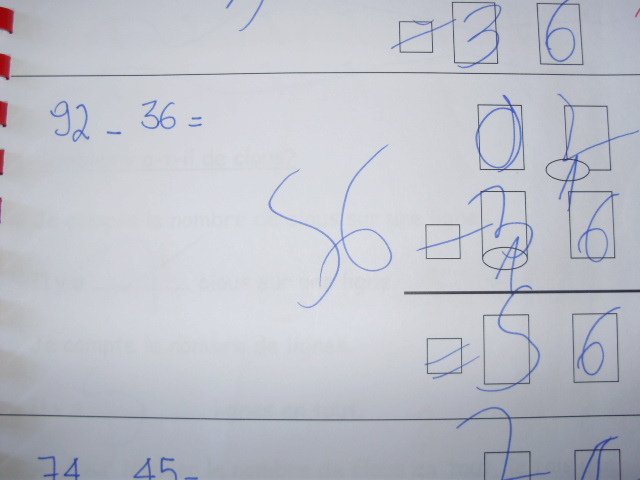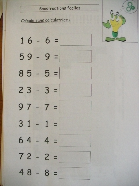 - Des soustractions simples de nombres à deux chiffres, avec retenue.