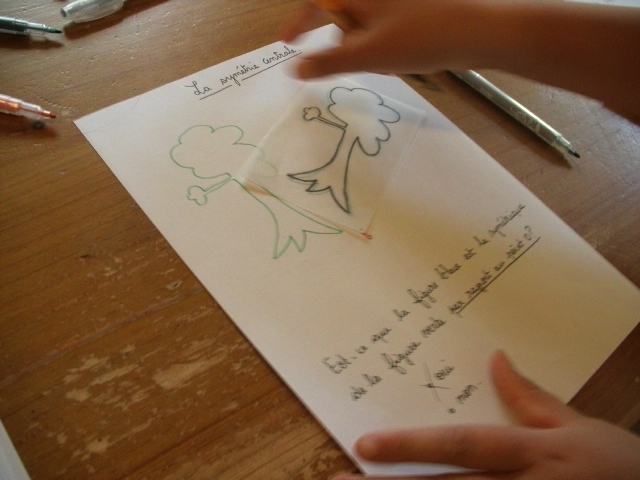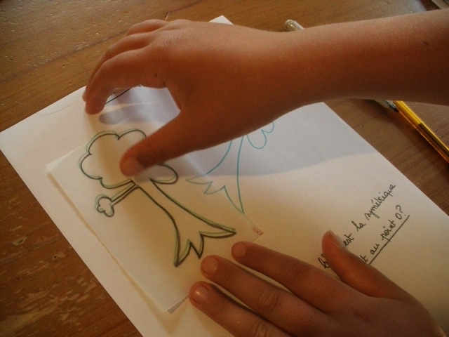L'enfant pose le calque que j'ai dessiné sur le dessin vert.