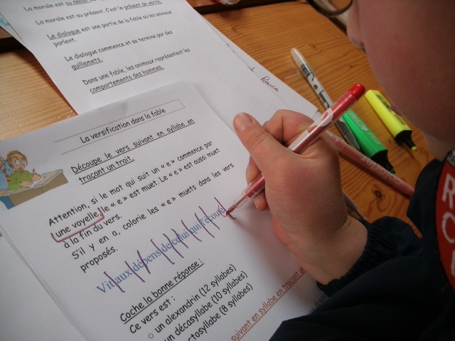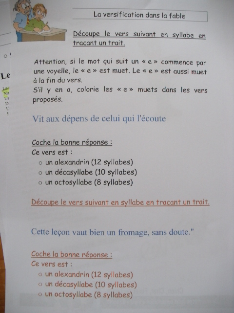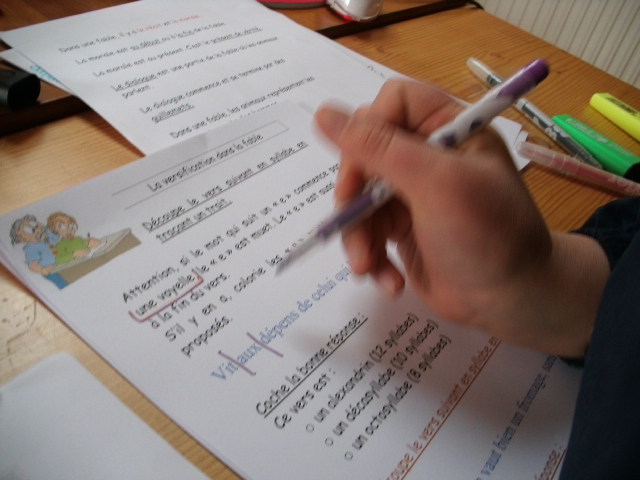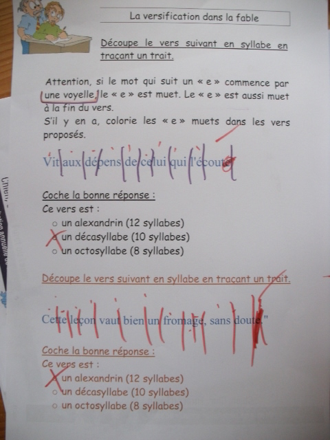 On apprend à découper le ver pour compter "les pieds". C'est quelque chose que l'on a déjà abordé en primaire en poésie (voir ici). La difficulté majeure est la prononciation ou non du "e" des syllables. Dans certains cas, le "e" est muet.