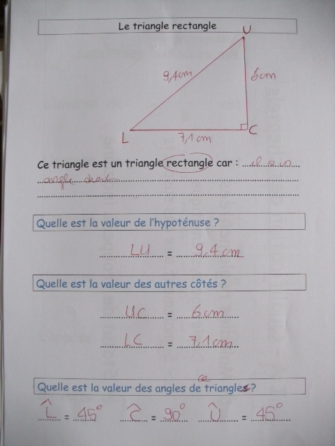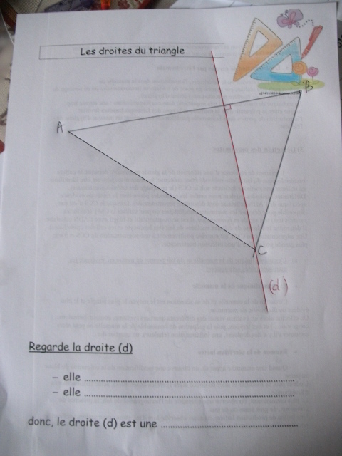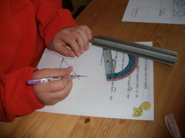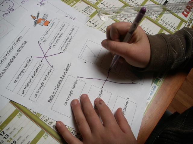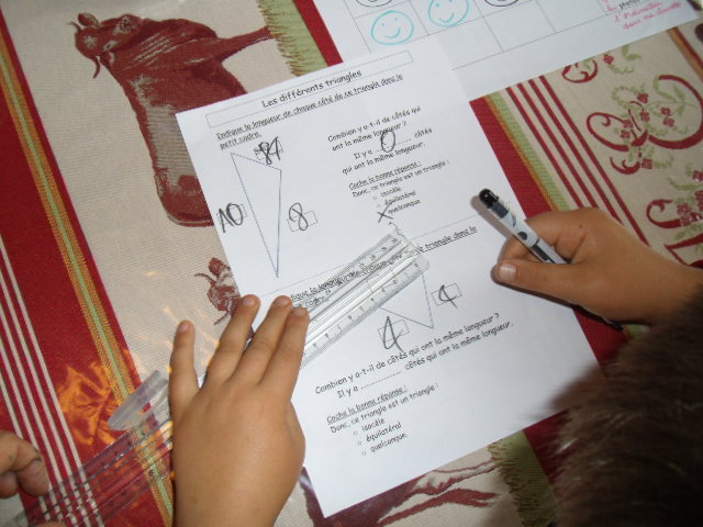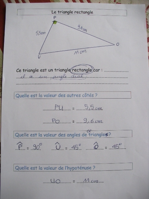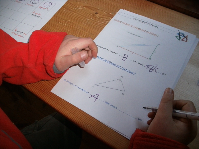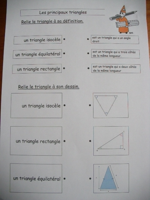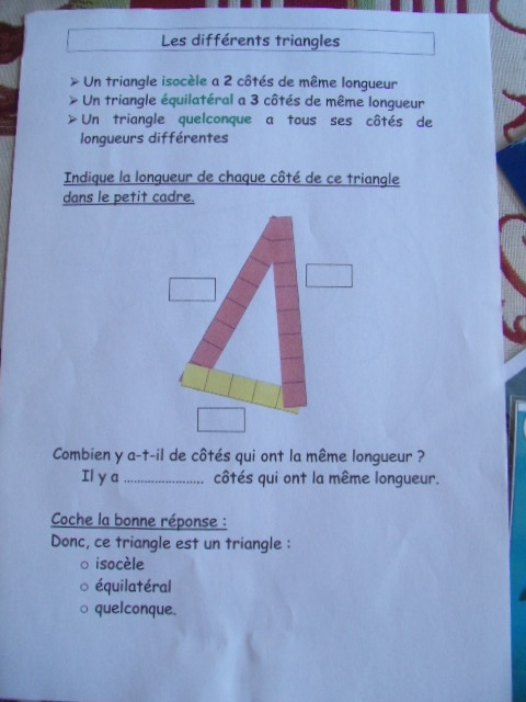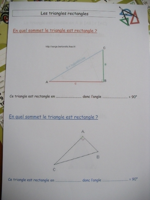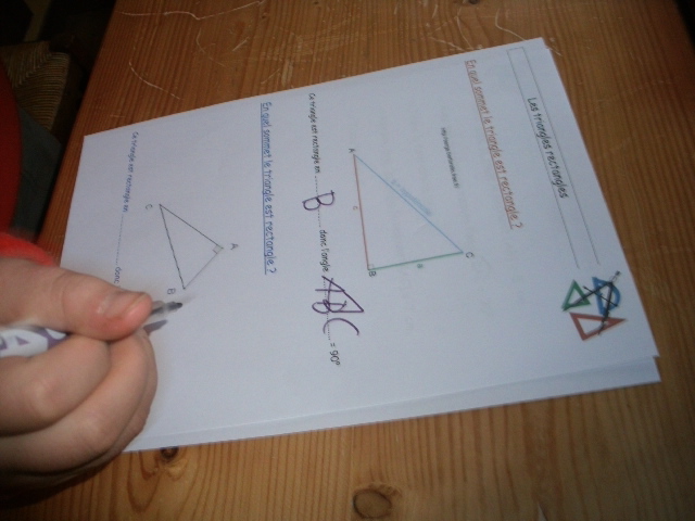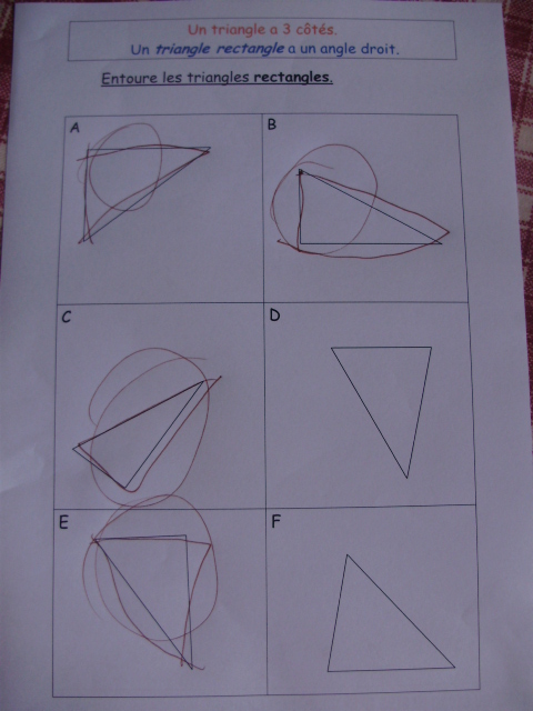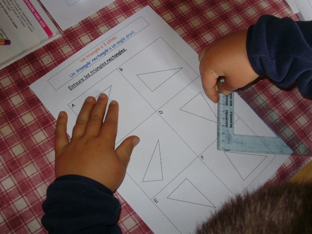 Ce travail permet d'allier deux notions précedemment travaillées : la reconnaissance du triangle et celle de l'angle droit.