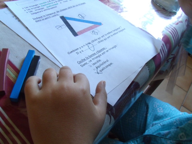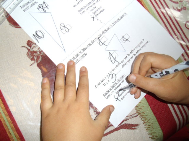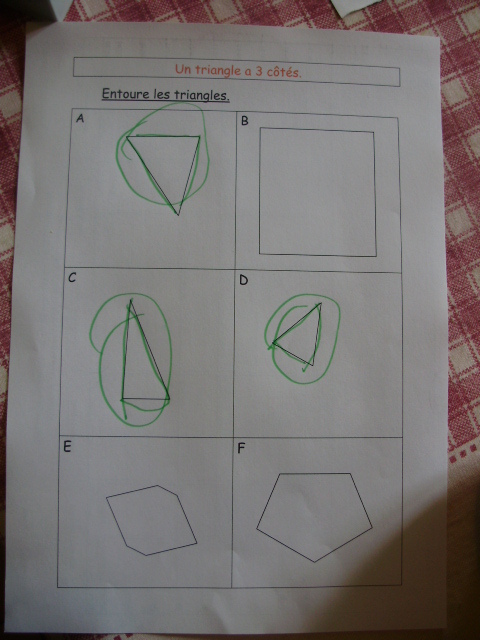 | Je lui demande de repasser les côtés au fur et à mesure qu'il les compte. | Puis, il entoure les triangles qu'il a trouvé. |