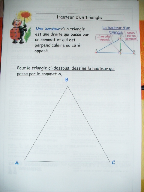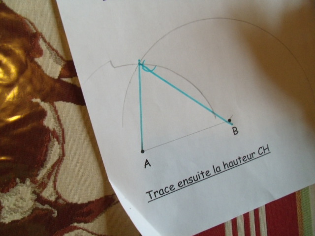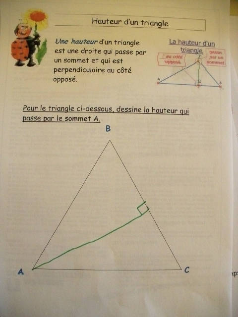 sommet A; alors, on trace la hauteur et on indique bien l'angle droit.