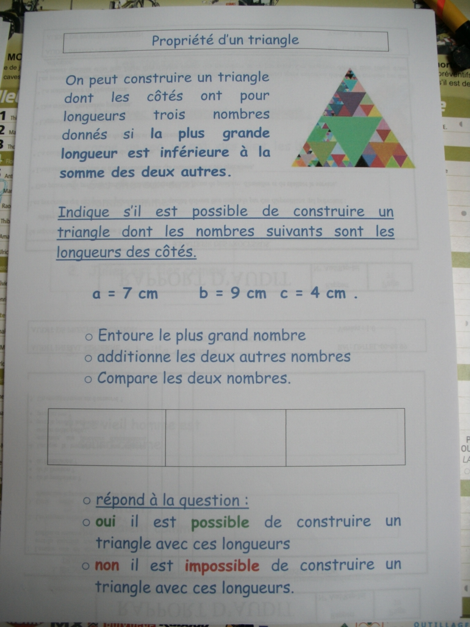 peut ou non faire un triangle avec les trois longueurs proposées.