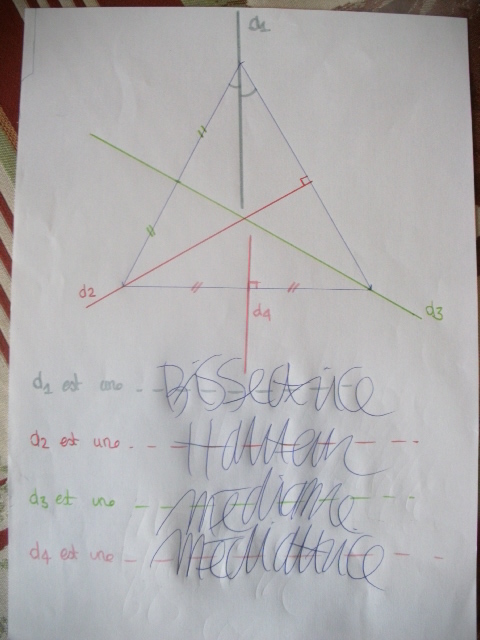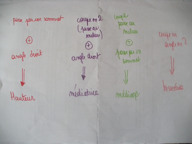 En cinquième, on reprend le notions de médiatrice (voir ici), bissectrice (voir ici) et hauteur (voir ici)