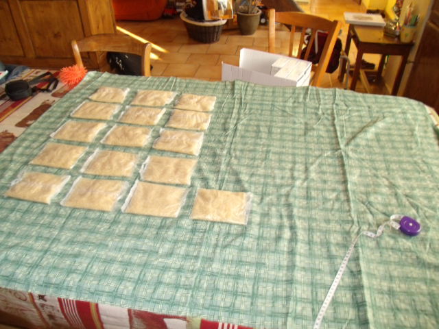 J'ai d'abord posé les sachets de riz sur ma pièce de tissu pour voir comment les répartir.