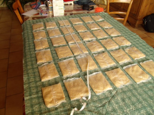 L'objectif est que, finies, ces bandes mesurent 16 cm de large ; mais, là aussi, il faut prévoir les ourlets et la couture